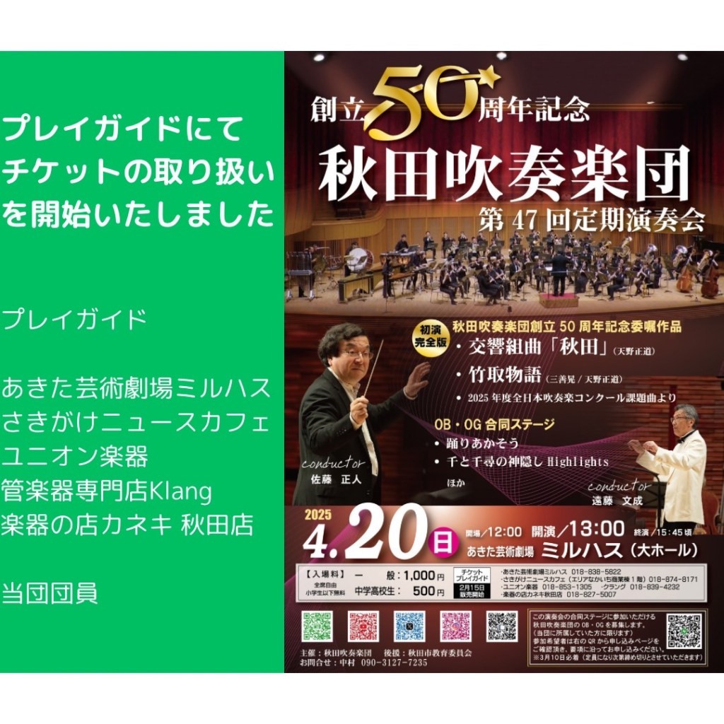 記念の定期演奏会を、4月20日(日)あきた芸術劇場ミルハスで開催します。