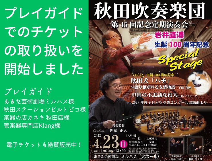 プレイガイドでのチケット販売を開始いたしました! あきた芸術劇場ミルハス様 1F管理事務室でお買い求め頂けます。秋田ステーションビルトピコ様 2Fサービスカウンターでお買い求め頂けます。楽器の店カネキ 秋田店様 アクセス続きを読む “第45回記念定期演奏会チケットプレイガイド販売開始のお知らせ”